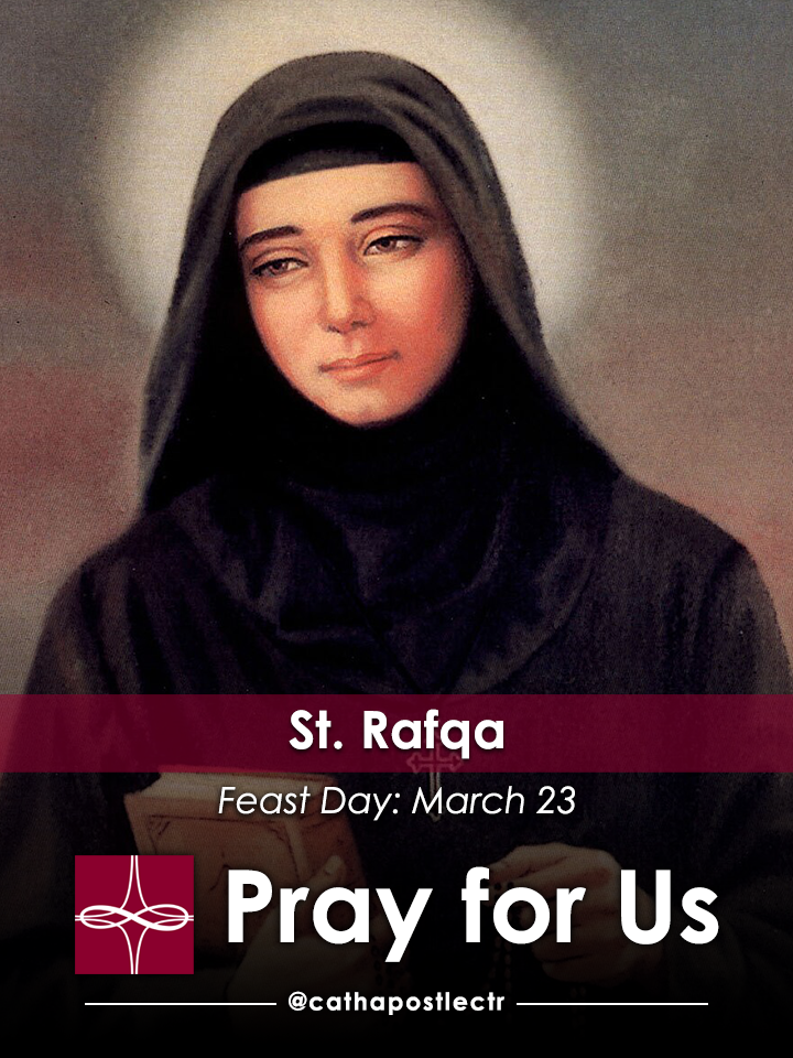 St. Rafqa Pietra Chobok was known for her personal piety as a Lebanese Maronite nun. From a young age, she knew she wanted to be a nun, and when she was thirty, she officially joined the Mariamette Sisters. She spent her time as a nun in various monasteries throughout Lebanon where her experiences in personal prayer inspired the hard work that she performed in her order. Even as she became more well-known for her personal piety, she remained humble and obedient to her superiors. She was canonized in 2001 by Pope John Paul II.