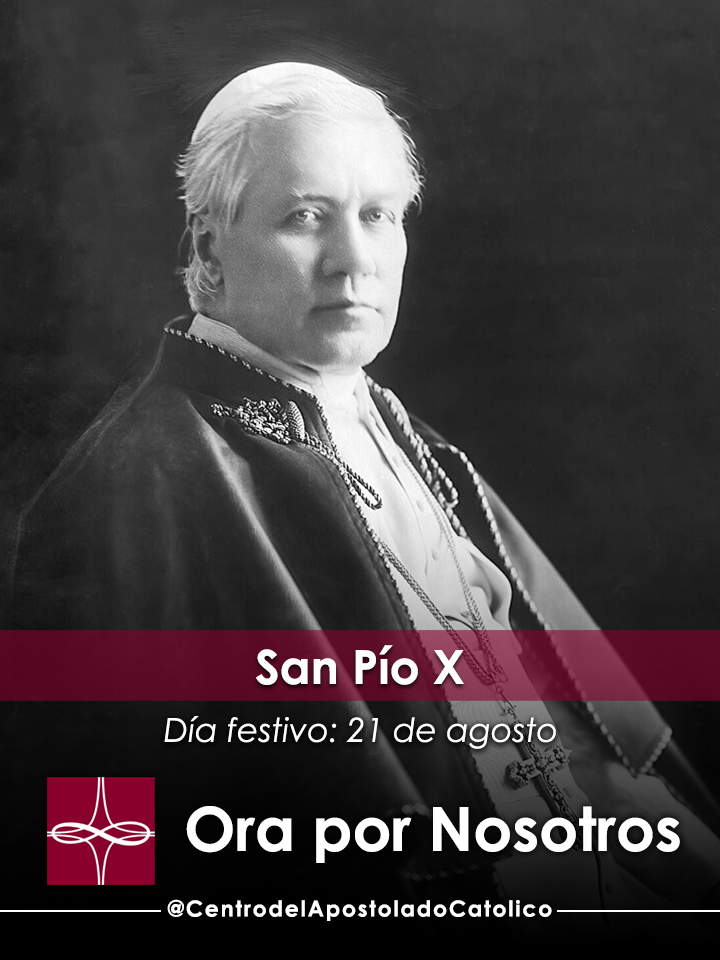 San Pío X fue Papa desde 1903 hasta 1914. Aunque nació en la pobreza, sobresalió como estudiante y continuó sus estudios incluso después de su ordenación al sacerdocio en 1858. Con el tiempo se convirtió en profesor de teología en un seminario y fue nombrado Obispo de Mantua en 1884. En 1893, el Papa León XIII lo nombró Cardenal y Patriarca de Venecia, así llamado por su devoción al bienestar social de la gente en su arquidiócesis. Cuando fue elegido Papa en 1903, Pío X tomó como lema, "restaurar todo en Cristo". A lo largo de su pontificado, promovió la recepción diaria de la comunión, bajó la edad de la primera comunión de 12 a 7, promovió el uso del canto gregoriano y publicó el primer Código de Derecho Canónico. Justo antes de su muerte en 1914, aprobó planes para construir lo que se convertiría en la Basílica del Santuario Nacional de la Inmaculada Concepción en Washington, DC. Pío X fue beatificado en 1951 y canonizado en 1954, en ambas ocasiones por el Papa Pío XII.